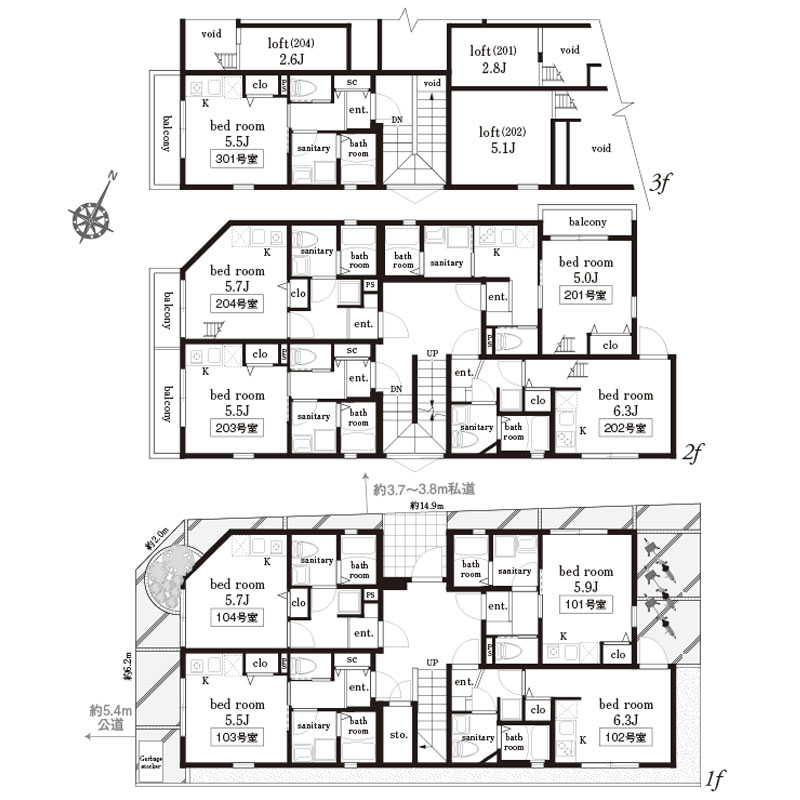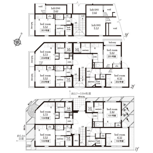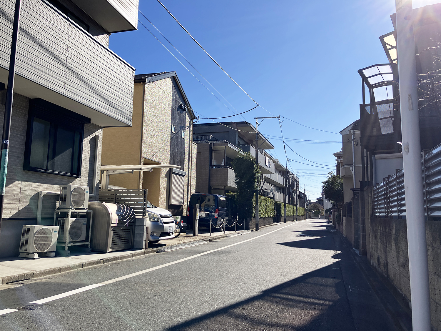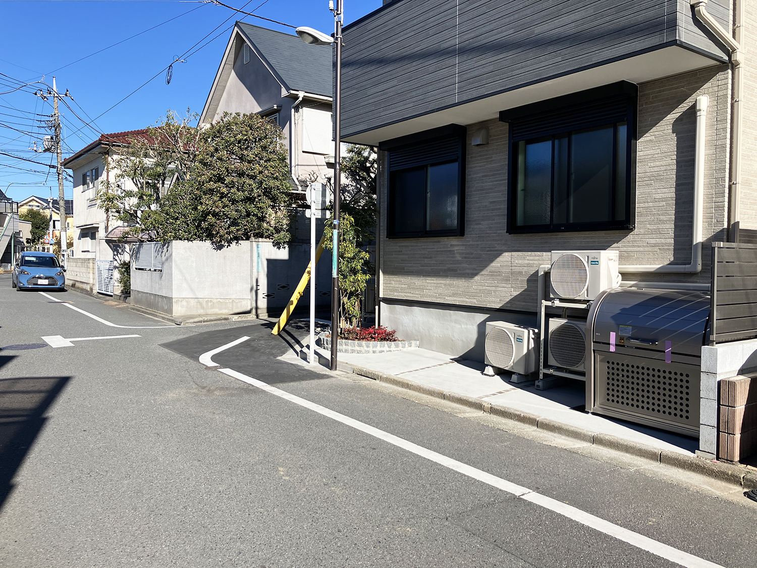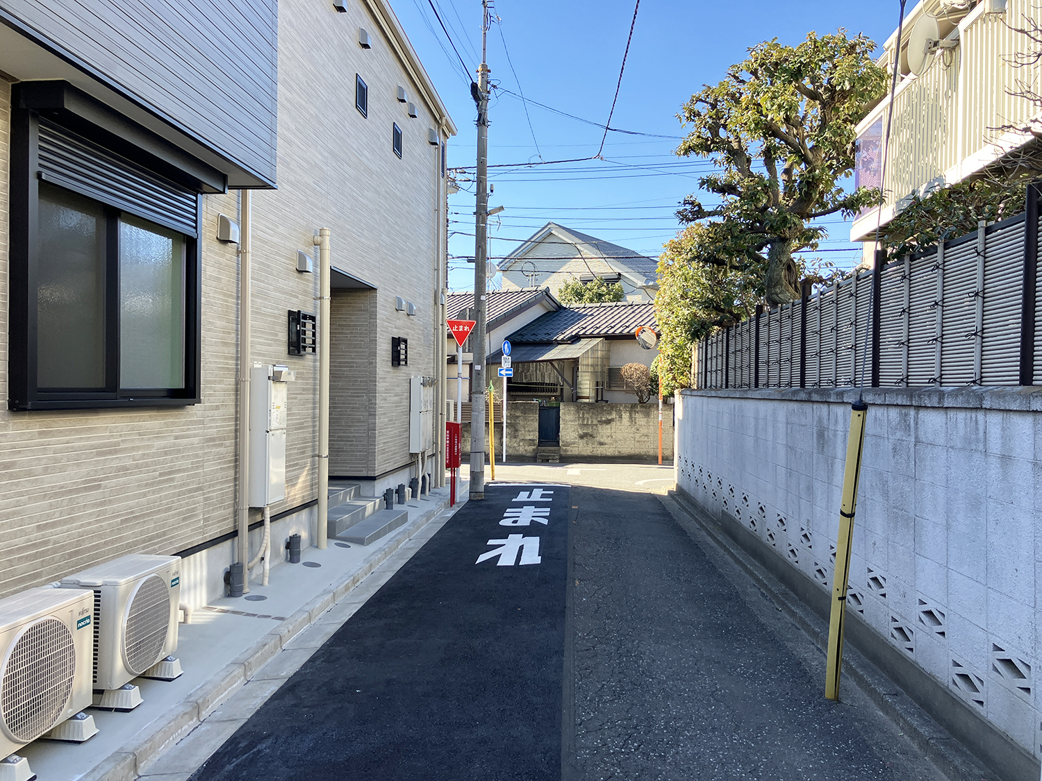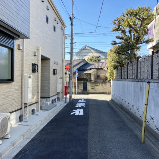 - 南西側公道約5.4m・北西側私道約3.7m~3.8m
